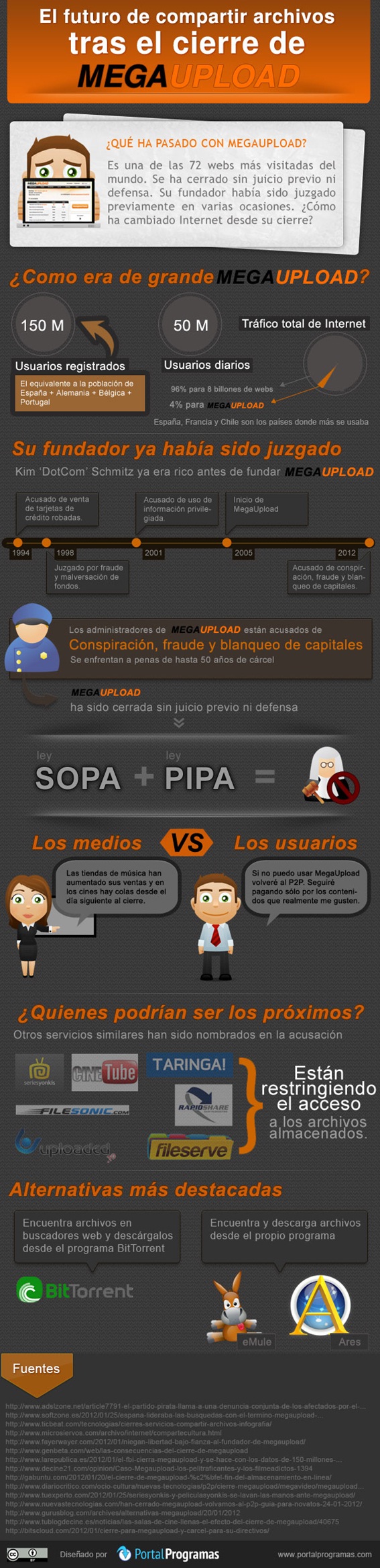 En portalprogramas.com se ha publicado esta infografía con datos relacionados con la caída del gran megaupload. En ella tocan todos los temas: